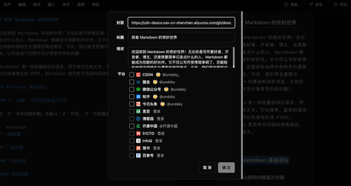 整合了 md 和 cose,提供优雅的 Markdown 编辑体验,并支持将文章同步发布到多个内容平台。