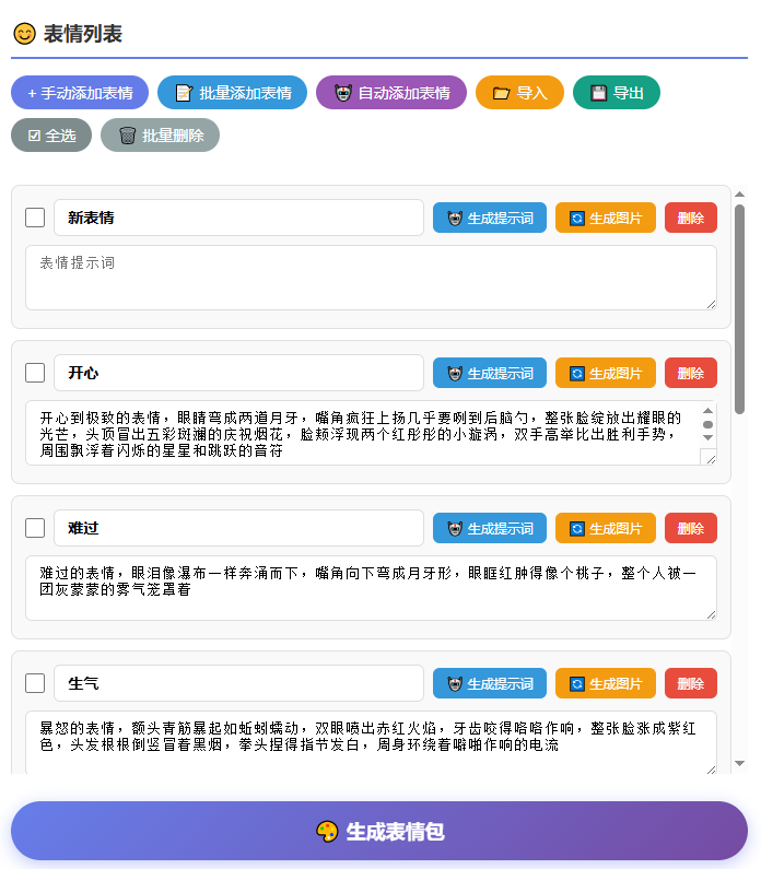+ 批量添加表情:点击后输入表情名称,调用大语言模型自动生成