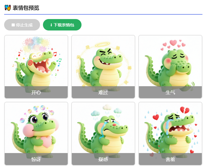 + 点击后根据参考图和表情列表调用生图模型生成表情图