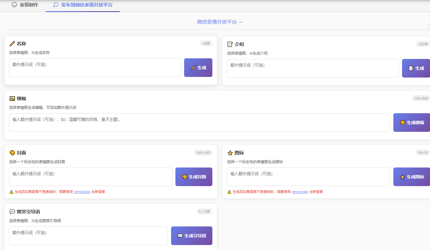 上下布局,上部为标题,微信表情开放平台,点击后跳转到微信表情官网:https://sticker.weixin.qq.com/,下部分为发布到微信表情需要的图片和文案,具体内容如下: