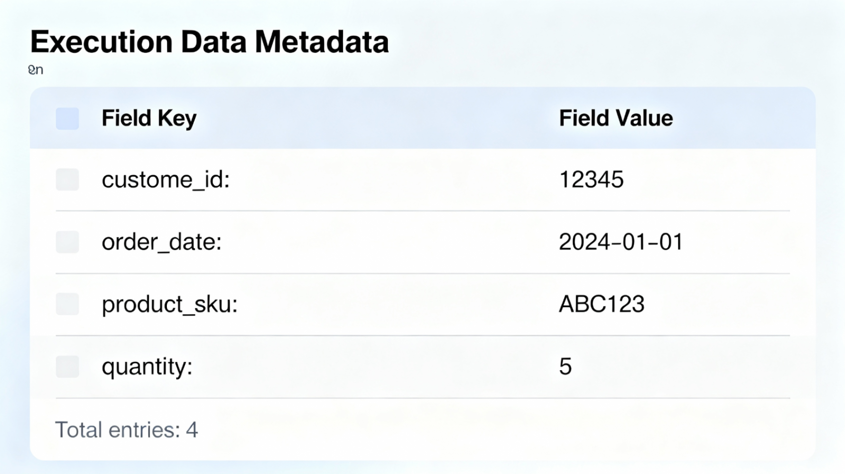 }order_id 或 customer_email 快速搜索到这条执行记录customer_id 而不是 cid)Q: Execution Data节点和Code节点中的 $execution.customData 有什么区别?