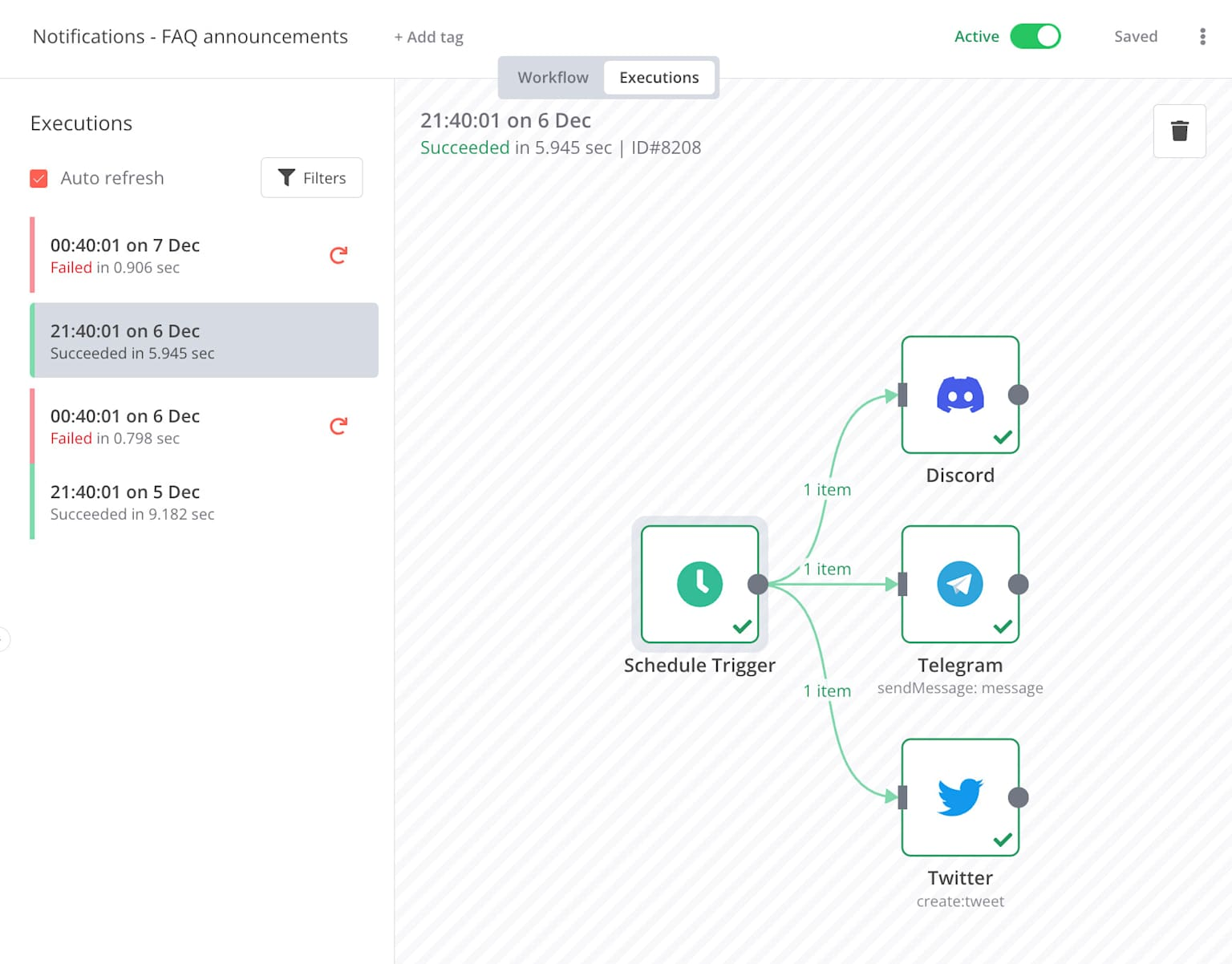 Manual Trigger 换成 Schedule Trigger,实现每天早上自动跑一次;Set 后面再加一个节点(比如 Email、Telegram 等),把这条消息真正发出去。[1] 官方文档: https://docs.n8n.io/workflows/create/